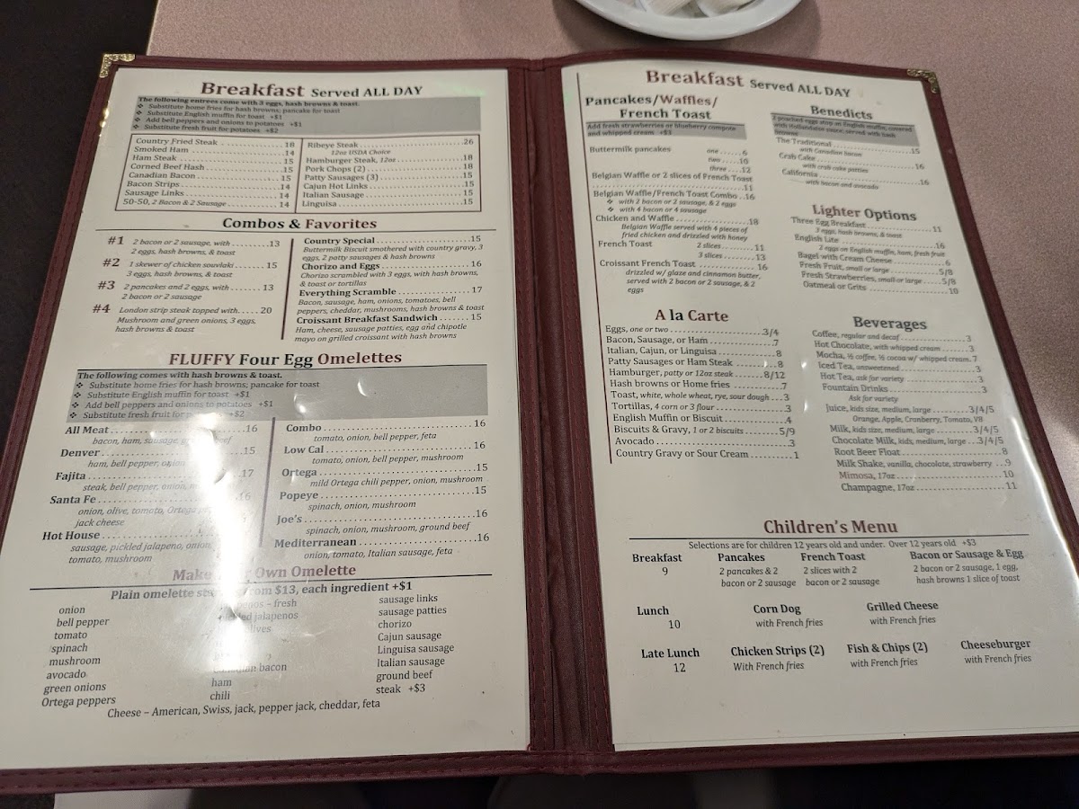 The omelette selection is equally impressive, with options like the Denver Omelette ($10.45), packed with ham, onions, and bell peppers, ensuring every forkful is a delicious experience. And for those with a taste for adventure, the Fajita Steak Omelette ($11.45) combines the bold flavors of seasoned steak with fresh vegetables for an unforgettable meal.