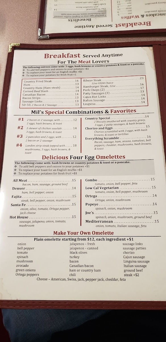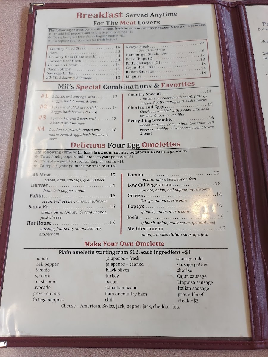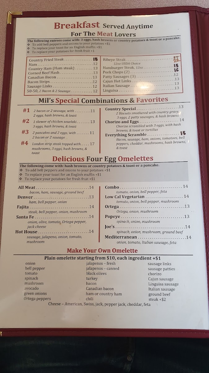Mil's Diner is famous for its expansive breakfast menu, where every bite promises comfort and satisfaction. Indulge in the delicious Country Fried Steak ($11.95), perfectly breaded and smothered in rich gravy, or opt for the classic Mil's #3 Special, featuring fluffy buttermilk pancakes, eggs cooked to order, and your choice of perfectly crispy bacon or savory sausage ($8.95). For those seeking a robust breakfast to fuel your adventures, the 12oz Ribeye Steak ($15.95) is a must-try — tender, juicy, and bursting with flavor.